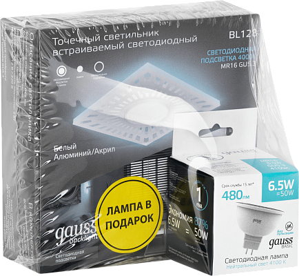К светотехнике на любом объекте, будь то жилое помещение или коммерческая площадка, предъявляют высокие требования. Необходимо не только продумать конфигурацию всех приборов, безопасную схему подключения, суммарную мощность и нагрузку на сеть, но и учесть требования дизайна, поскольку эстетике сегодня уделяется большое внимание. Набор Gauss Светильник Backlight BL128 3W + Лампа MR16 6,5W 480lm 4100K GU5.3 LED (BL128P) — современное решение, в котором учтены все требования. За надежность отвечают материалы с большим запасом прочности. Все элементы конструкции без проблем выдерживают интенсивную эксплуатацию. Такой вдумчивый подход к деталям является визитной карточкой бренда Gauss.