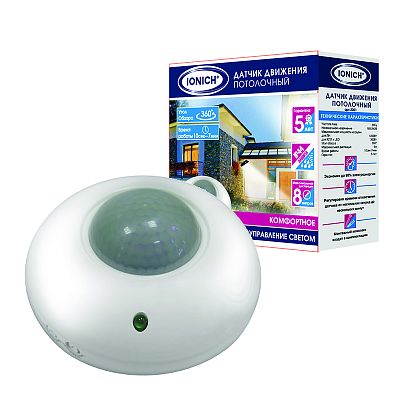 К светотехнике на любом объекте, будь то жилое помещение или коммерческая площадка, предъявляют высокие требования. Необходимо не только продумать конфигурацию всех приборов, безопасную схему подключения, суммарную мощность и нагрузку на сеть, но и учесть требования дизайна, поскольку эстетике сегодня уделяется большое внимание. Датчик движения, потолочный, 8 м, 1200Вт, 7 мин, белый (2201) — современное решение, в котором учтены все требования. За надежность отвечают материалы с большим запасом прочности. Все элементы конструкции без проблем выдерживают интенсивную эксплуатацию. Такой вдумчивый подход к деталям является визитной карточкой бренда IONICH.