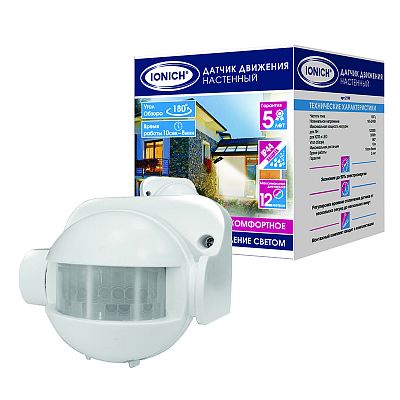 К светотехнике на любом объекте, будь то жилое помещение или коммерческая площадка, предъявляют высокие требования. Необходимо не только продумать конфигурацию всех приборов, безопасную схему подключения, суммарную мощность и нагрузку на сеть, но и учесть требования дизайна, поскольку эстетике сегодня уделяется большое внимание. Датчик движения, настенный, 12 м, 1200Вт, 8 мин, белый (2199) — современное решение, в котором учтены все требования. За надежность отвечают материалы с большим запасом прочности. Все элементы конструкции без проблем выдерживают интенсивную эксплуатацию. Такой вдумчивый подход к деталям является визитной карточкой бренда IONICH.