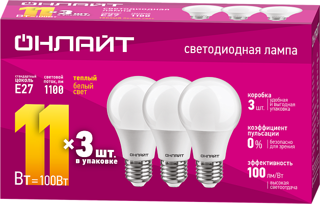К светотехнике на любом объекте, будь то жилое помещение или коммерческая площадка, предъявляют высокие требования. Необходимо не только продумать конфигурацию всех приборов, безопасную схему подключения, суммарную мощность и нагрузку на сеть, но и учесть требования дизайна, поскольку эстетике сегодня уделяется большое внимание. Лампа ОНЛАЙТ 90 602 OLL-A60-11-230-2.7K-E27-PACK3 (90602) — современное решение, в котором учтены все требования. За надежность отвечают материалы с большим запасом прочности. Все элементы конструкции без проблем выдерживают интенсивную эксплуатацию. Такой вдумчивый подход к деталям является визитной карточкой бренда Онлайт.