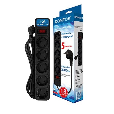 При подборе розеток, выключателей и других элементов для работы с электроэнергией учитывают не только электротехнические параметры, но и эстетику. Фильтр-удлинитель "DOMTOK" 5гн., ПВС 3*1, 10А/2,2кВт черный с/з 1,8м (2537) — одна из лучших моделей в своем классе по обоим критериям. Производитель DOMTOK сделал ставку на простую надежную конструкцию и современные материалы, которые обладают высокой устойчивостью к износу. Продукция прошла строгую проверку на безопасность и рассчитана на многолетнюю эксплуатацию в интенсивном режиме. Как официальный дистрибьютор мы готовы поставить любое количество товаров в кратчайшие сроки.