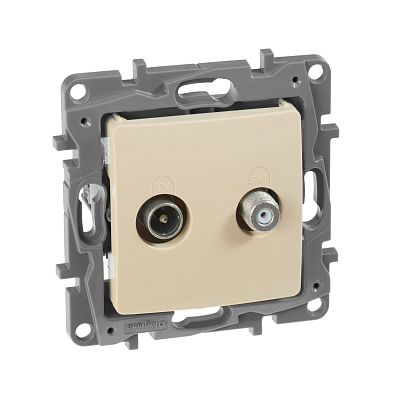 При подборе розеток, выключателей и других элементов для работы с электроэнергией учитывают не только электротехнические параметры, но и эстетику. ETIKA Розетка двойная TV+SAT тип звезда слоновая кость (672357) — одна из лучших моделей в своем классе по обоим критериям. Производитель IEK сделал ставку на простую надежную конструкцию и современные материалы, которые обладают высокой устойчивостью к износу. Продукция прошла строгую проверку на безопасность и рассчитана на многолетнюю эксплуатацию в интенсивном режиме. Как официальный дистрибьютор мы готовы поставить любое количество товаров в кратчайшие сроки.