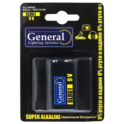 Безопасность, простота использования, долгий срок службы — три базовых требования к элементам питания и зарядным устройствам. Батарейка General GBAT-6LR61 щелочная (9В тип крона) 1шт в блист (800563) (1/12/192) (800563) по этим параметрам в топе. Отличается высоким эксплуатационным ресурсом и стабильной работой под нагрузкой. Надежность продукции General Lighting Systems подтверждена в ходе многочисленных испытаний и уже неоднократно доказана на практике профессионалами и рядовыми покупателями. Вы можете сделать заказ на любое количество артикула 800563. На нашем складе всегда большой запас, поскольку мы работаем с производителем на правах официального дистрибьютора.