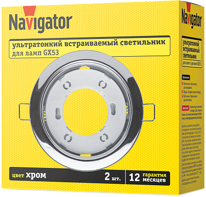 К светотехнике на любом объекте, будь то жилое помещение или коммерческая площадка, предъявляют высокие требования. Необходимо не только продумать конфигурацию всех приборов, безопасную схему подключения, суммарную мощность и нагрузку на сеть, но и учесть требования дизайна, поскольку эстетике сегодня уделяется большое внимание. Светильник Navigator 95 461 NGX-R1-003-GX53-PACK2(Хром 2шт/уп) (95461) — современное решение, в котором учтены все требования. За надежность отвечают материалы с большим запасом прочности. Все элементы конструкции без проблем выдерживают интенсивную эксплуатацию. Такой вдумчивый подход к деталям является визитной карточкой бренда Navigator.
