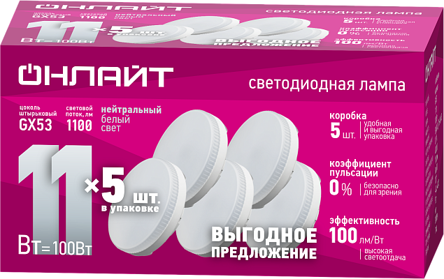 К светотехнике на любом объекте, будь то жилое помещение или коммерческая площадка, предъявляют высокие требования. Необходимо не только продумать конфигурацию всех приборов, безопасную схему подключения, суммарную мощность и нагрузку на сеть, но и учесть требования дизайна, поскольку эстетике сегодня уделяется большое внимание. Лампа ОНЛАЙТ 90 614 OLL-GX53-11-230-4K-PACK5 (90614) — современное решение, в котором учтены все требования. За надежность отвечают материалы с большим запасом прочности. Все элементы конструкции без проблем выдерживают интенсивную эксплуатацию. Такой вдумчивый подход к деталям является визитной карточкой бренда Онлайт.