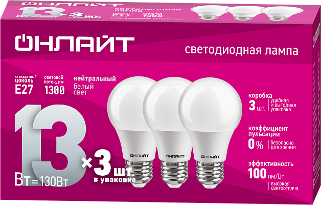 К светотехнике на любом объекте, будь то жилое помещение или коммерческая площадка, предъявляют высокие требования. Необходимо не только продумать конфигурацию всех приборов, безопасную схему подключения, суммарную мощность и нагрузку на сеть, но и учесть требования дизайна, поскольку эстетике сегодня уделяется большое внимание. Лампа ОНЛАЙТ 90 605 OLL-A60-13-230-4K-E27-PACK3 (90605) — современное решение, в котором учтены все требования. За надежность отвечают материалы с большим запасом прочности. Все элементы конструкции без проблем выдерживают интенсивную эксплуатацию. Такой вдумчивый подход к деталям является визитной карточкой бренда Онлайт.